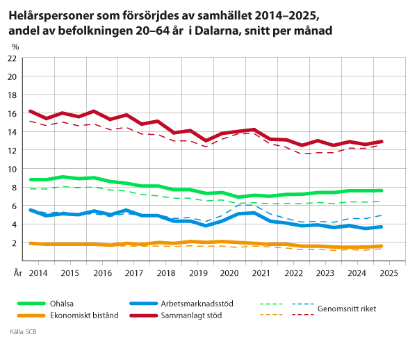 Under första halvåret 2025 ökade antalet helårspersoner som försörjs av sociala ersättningar och bidrag något, både i Dalarna och i riket, jämfört med samma period året före. Andelen bidragstagare i länet har sedan 2014 minskat från 16,2 procent till dagens 12,9 procent av befolkningen i arbetsför ålder. Men sedan 2020 ökar ersättningarna vid ohälsa stadigt igen.