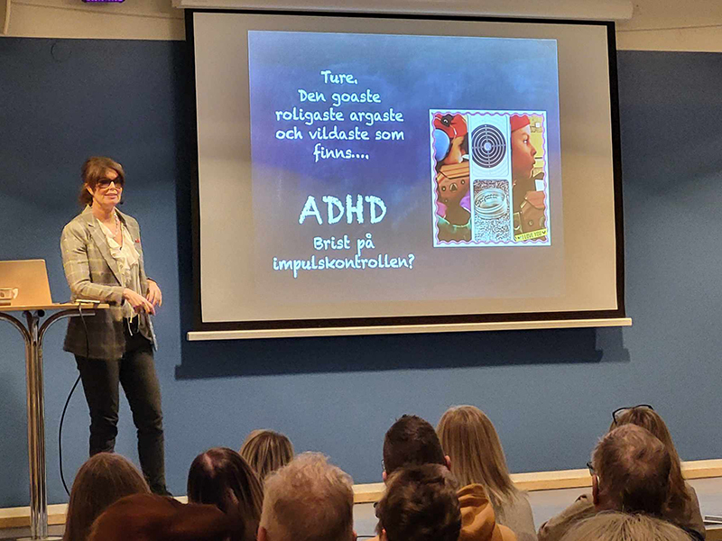 Sara Melin , lilla Speedos mamma, föreläste om hur livet kan te sig iör en familj där tre barn har olika NPF-diagnoser. Runt 110 åhörare skrattade och grät om vartannat.